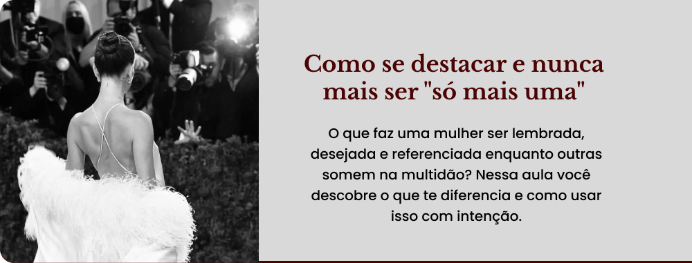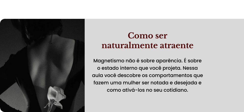 Técnicas práticas de magnetismo e presença para ser notada, lembrada e desejada sem precisar implorar atenção. Entra no dia 15 quando você já tem a base e o posicionamento. Agora vem o magnetismo.