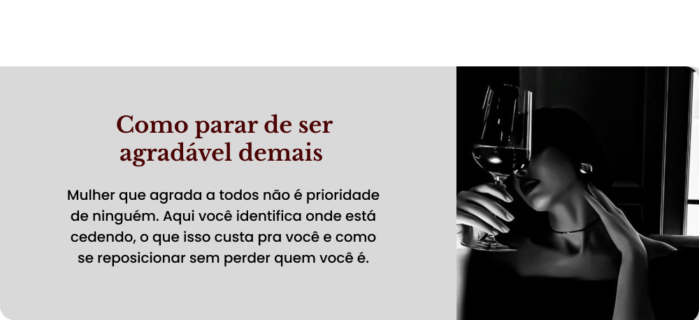 Entregue no dia 21 como fechamento da jornada. O ebook aprofunda o arquétipo da mulher inabalável, o áudio de ativação reforça o novo padrão, e o wallpaper é um lembrete visual diário de quem você decidiu se tornar.