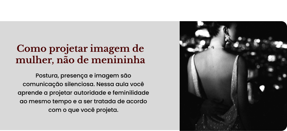Um plano estratégico completo para transformar sua imagem, postura e presença em 90 dias. Você começa no dia 1 sabendo exatamente onde vai chegar.